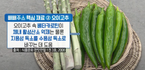 빼빼주스는 체내에서 제거하기 어려운 독소 중 하나인 지용성 독소를 수용성 독소로 바꾸어 몸밖으로 배출 시켜 줍니다. 특히 주재료인 아스파라거스속 글루타티온이라는 성분은 간기능을 높여 지용성 독소를 배출해주는 탁월한 재료입니다. 지용성 독소가 수용성으로 변환되어 몸밖으로 빠져나오려면 간을 거쳐 나와야 하기때문에 간해독은 정말 중요한 과정입니다. 또한 오이고추에 들어있는 베타카로틴은 체내 활성산소 억제는 물론 지용성 독소를 수용성 독소로 바꾸는 데 도움이 되는 재료입니다.