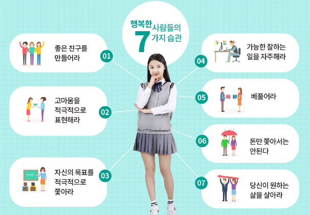아래는 스트레스 관리에 도움이 되는 행복한 사람들의 7가지 습관입니다.